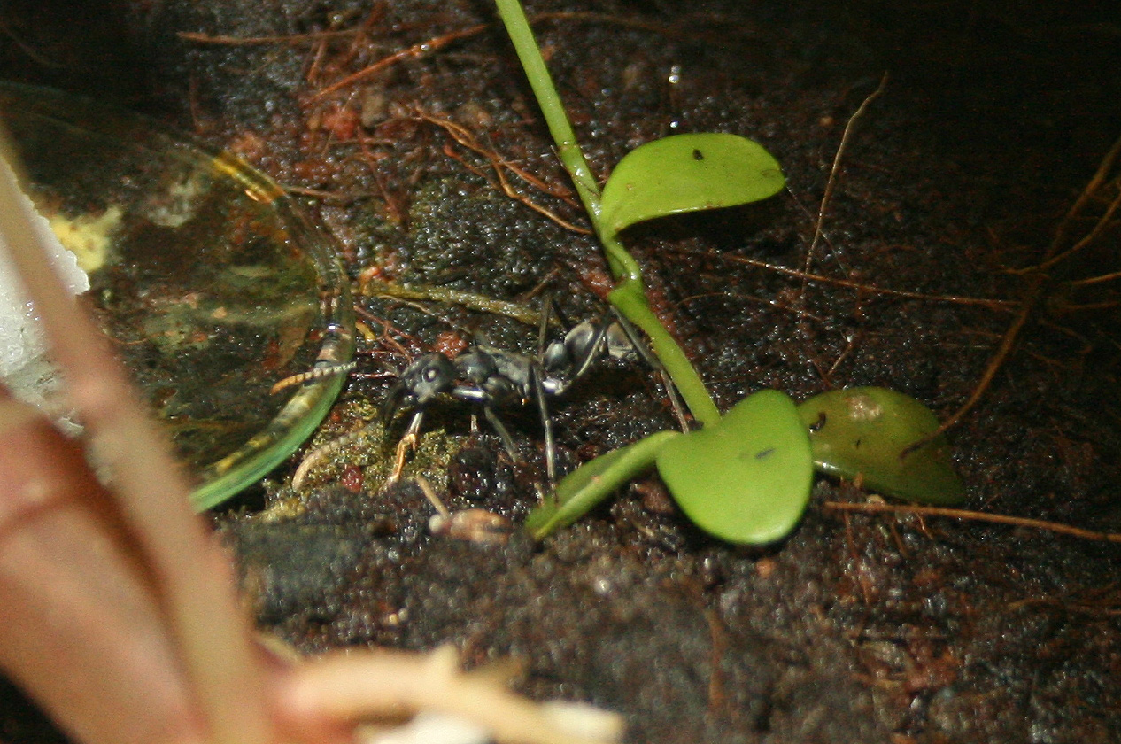 Die Aktivität ist mittlerweile bei allen Arten höher, daran sieht man dass die Kolonien wachsen. Die Pachycondyla apicalis sind natürlich am aktivsten, da sie auch mit der größten Kolonie eingesiedelt wurden. Sie haben auch mittlerweile ein Zweignest gegündet wies scheint. Die meisten Nester habe ich bisher auch aufgespürt, nur das der Gigantiops destructor habe ich noch nicht finden können.