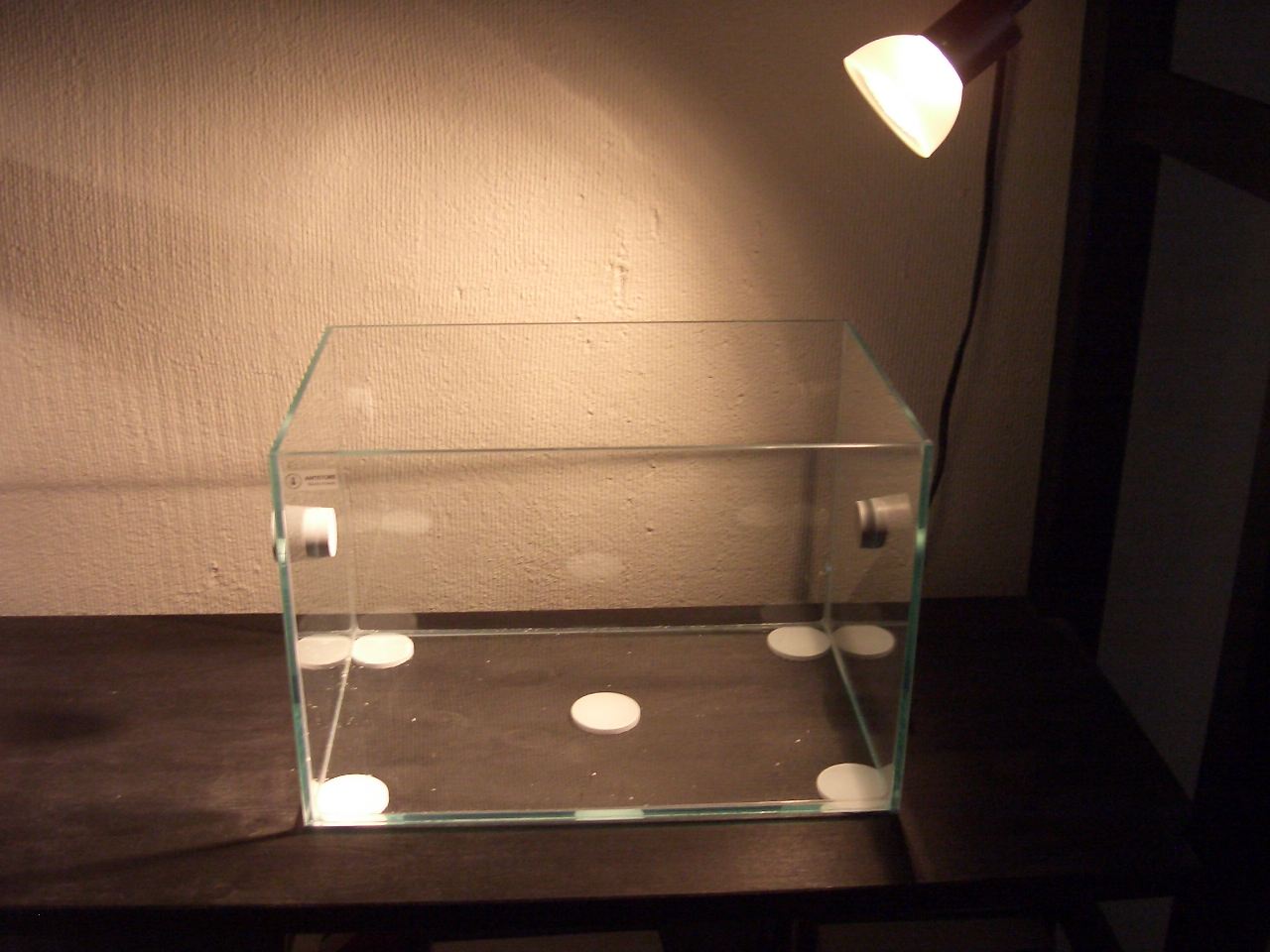 Es ist ein 30x20x20 Becken mit Deckel und 2 Stopfen, Halogenspot und einem 40mm Ventilator und einem Thermometer(das ist nicht auf den Bildern)