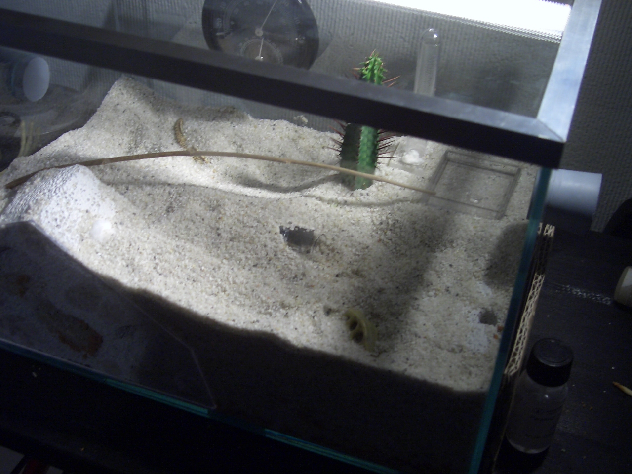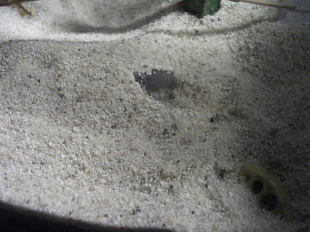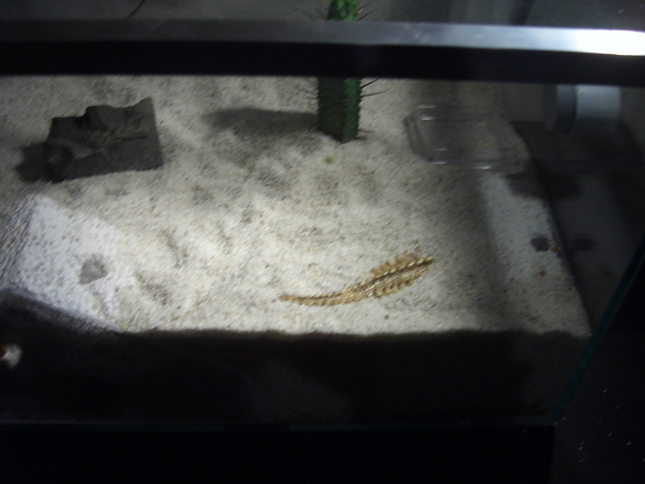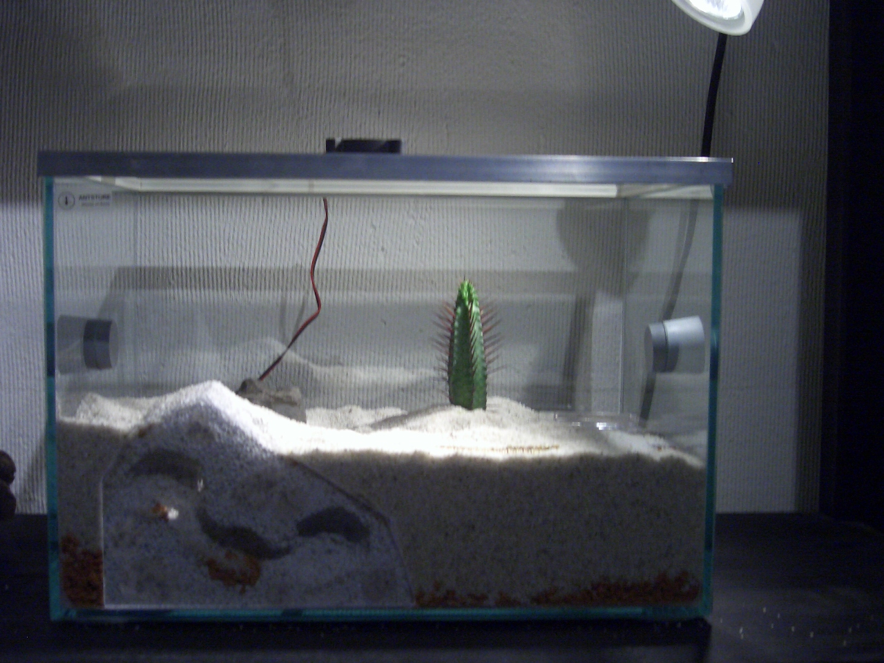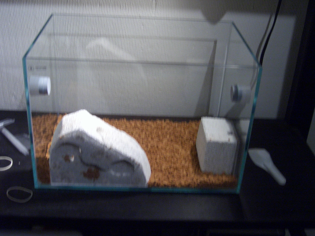 Drinne sind jetzt 2 Ytongs (3 und 2 Kammern) Seramis, Kies, ein Kaktus, ein Dinoschwanz (^^) und ein Stein.