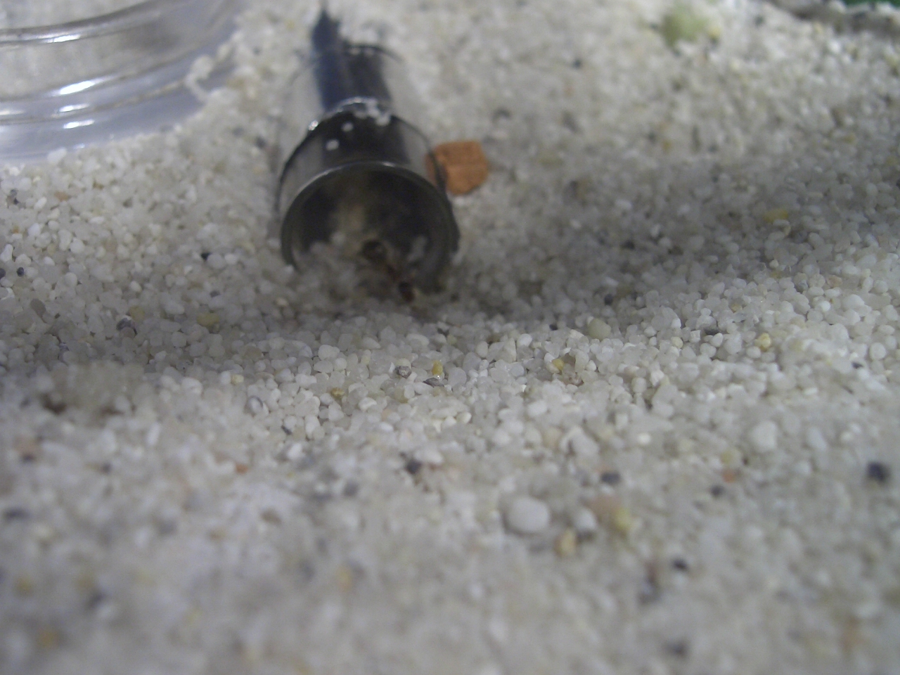 heute nahm ich das RG raus, gucke nach und wer glotze mich an? Die erste Arbeiterin!!! Sie ist ca 7mm groß und noch nicht ausgefärbt, ich schätze sie ist heute oder gestern geschlüpft. Also nahm ich den Deckel von der Box, schnitt ein Loch rein, machte Parafinöl unter den Deckel. Dann machte ich Zuckerwasser, gab 2 Tropfen in einen Futternapf, Futternapf und kleine Tränke in die Arena und fertig.