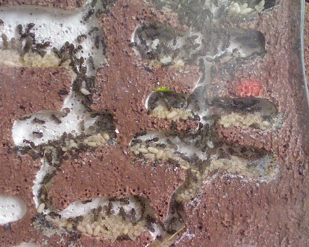 Zuerst wurden die Puppen innerhalb des YTongs gelagert, dann wurden sie direkt am YTong in den Schlauch gebracht, wo sie einige Tage lagerten. Anschliessend trugen die Ameisen die Puppen nach oben und lagerten sie sie zwar noch im Schlauch, aber direkt am Eingang zur Arena. Also immer wieder woanders... Die letzten Tage sprühte ich immer wieder mal einige Tropfen Wasser in die Arena weil ich bemerkt habe, dass die Aktivität dann sprunghaft ansteigt. Ich dachte die würden dann mehr Futter vermuten und suchen die feuchten Stellen grundlich nach fressbarem ab. Nach einigen feuchten Tagen waren die Puppen dann auch in dem Schlauch direkt an der Arena weg, bis ich gestern bemerkte, dass die Puppen plötzlich von der Arena wieder in den Schlauch getragen wurden.