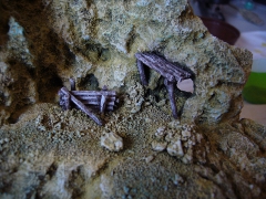 Zum Schluss sollten jetzt noch kleine Geröll- und Kieshäufchen dazu kommen. Dies wird ähnlich dem Anlegen der Wege gemacht. Mit angerührtem Holzleim, vermengt mit Vogel- und Welssand, wurden die Häufchen geformt. Die Geröllhäufchen erhielten noch kleine Kiesel, um größere Brocken darzustellen. Der bereits getrocknete Grubenholzhaufen kam im gleichen Arbeitsgang auch noch draufgeklebt. Mit einer Mischung aus Holzleim und Vogelsand als Kleber und Untergrund, damit unter dem Haufen keine Hohlräume entstehen. Zu guter Letzt klebte ich noch die Dachbalken der Mine auf. Hier benutzte ich die gleichen Holzstäbchen, wie beim Holzhaufen und bearbeitete sie auch mit dem Bastelmesser. Alles schön trocknen lassen.