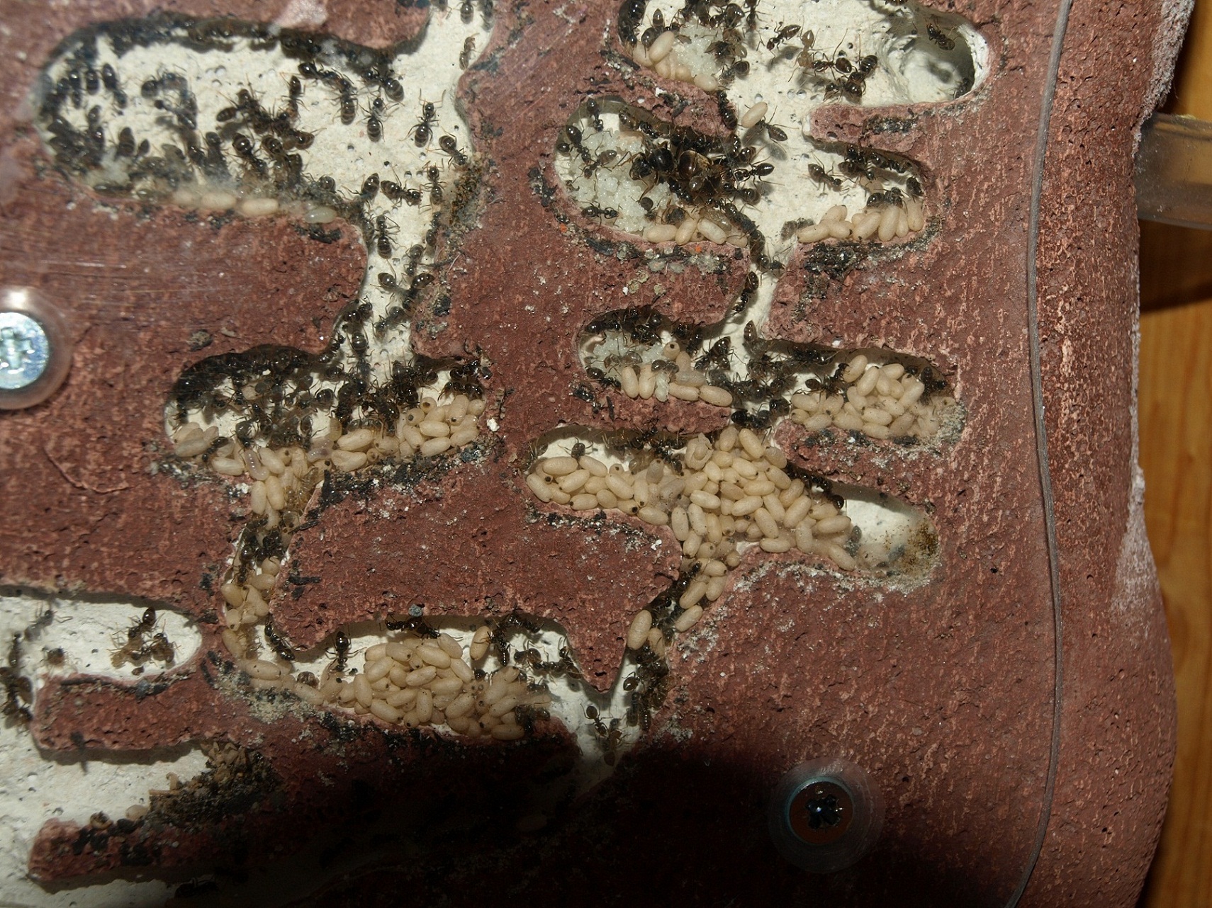 Der Umzug vom Acrylnest in den neuen Ytong ist seit einigen Tagen vollendet. Komischerweise quetscht sich die Kolonie größtenteils oben rechts rein. Die Ecke unten links ist bisher noch völlig ungenutzt.