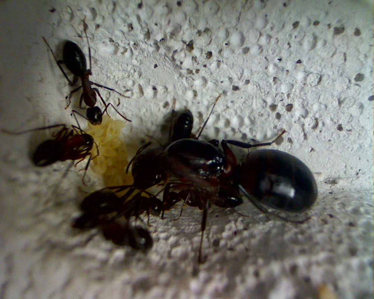 Königin mit insgesamt acht Arbeiterinnen wovon eine leider kurz darauf verstarb. Ich schiebe dies einfach mal auf den Transportstress, da die anderen sieben in "einwandfreiem Zustand" sind und bis heute leben. Nach der Ankunft habe ich das RG-Nest in ein kleinen Behälter gelegt, welcher mit einem Ytong verbunden war. Dieser Ytong hat anscheind so überzeugt, dass sie noch am selben Tag umgezogen und bis heute dort verblieben sind. Allerdings empfinde ich das Nest nicht gerade als eine Augenweide, daher werde ich wohl früher oder später ein anderes Nest anbieten. Eventuell auch ein Holznest, wobei ich eher dazu tendiere, Ytong und Holz miteinander zu kombinieren. Mit dem Bau des Nestes fange ich aber erst an, wenn ich eine Kamera zur Verfügung habe und dies dokumentieren kann. Dies dürfte ab April der Fall sein. Aber auf den Termin möchte ich mich jetzt nicht festlegen. Nachdem sich einige Wochen nicht viel bei der Kolonie tat, steckte ich sie in den Kühlschrank zur