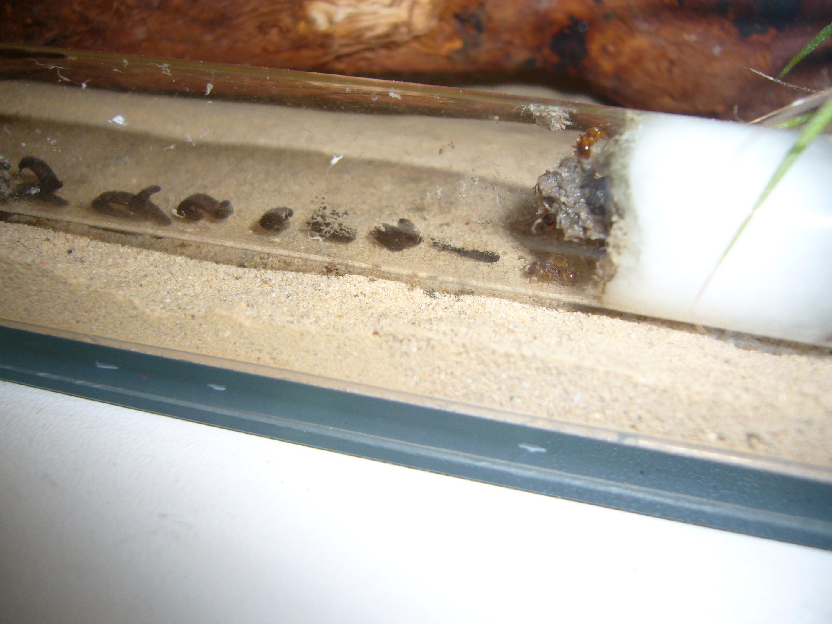 Als der erste Hunger gestillt war begannen sie "aufzuräumen". Wattefasern, und leider auch zwei Transportleichen, wurden aus dem Reagenzglas gebracht und in einer Ecke, weit entfernt vom Nesteingang, deponiert.