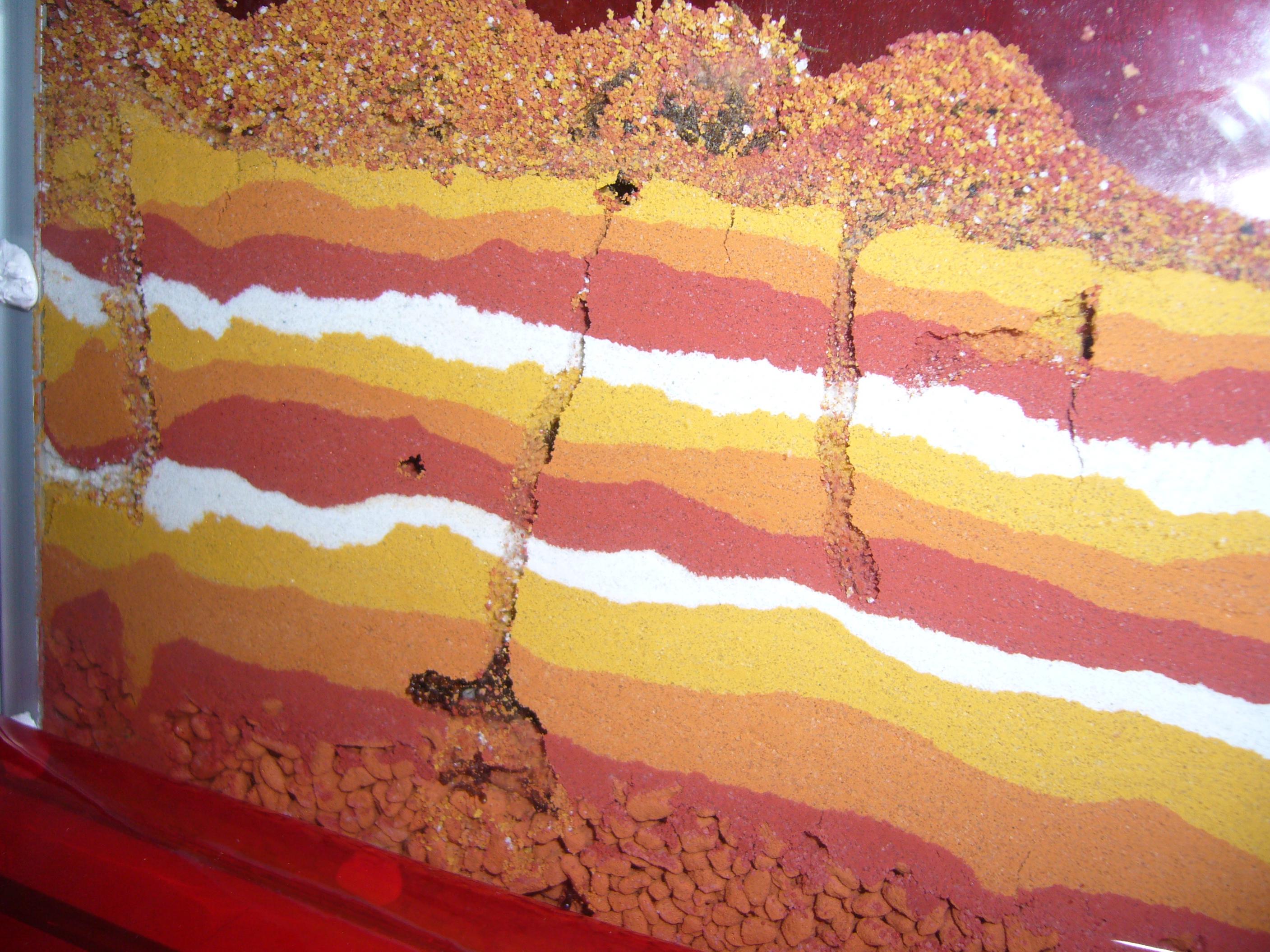 In der Arena befinden sich zwei Tränken, Futternäpfe eine Kunstharzwurzel das Reagenzglas... Als Boden dient eine ausgehärtete Sand-Lehm Mischung. Die kleine Leiter dient als Kletterhilfe und führt zur Bohrung.