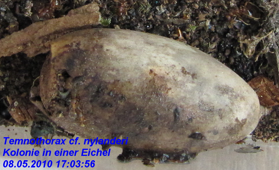10 dieser Eicheln beherbergten aber Kolonien von Temnothorax cf. nylanderi. Nachdem ich im Forum den Bericht von bettwurst über die Temnothorax-Kolonie bei seinen Camponotus ligniperda gelesen hatte, kam mir die Idee eine Kolonie der Temnothorax cf. nylanderi in eine Arena der Myrmica cf. rubra zu legen und ihr Zusammenleben zu beobachten. Die restlichen Kolonien habe ich wieder am Fundort ausgesetzt.