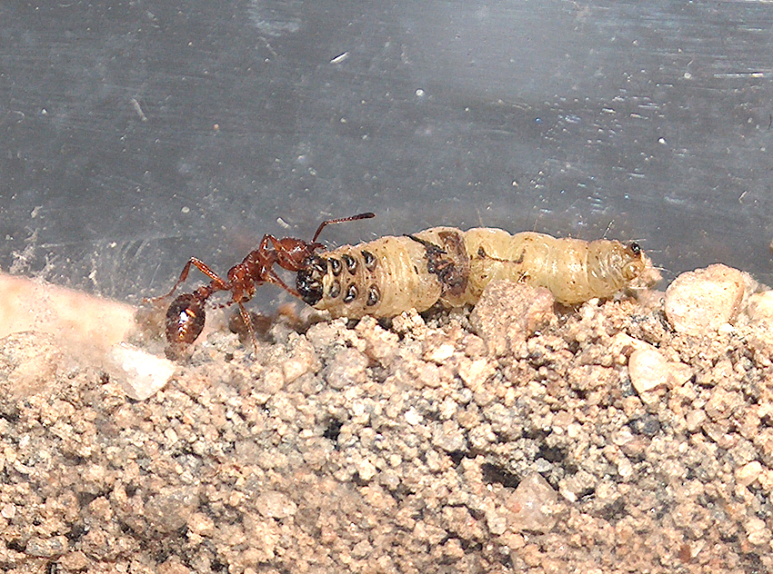 09.04. Heute in der Früh gabs die Überraschung (nicht nur das die tote schwar Mücke weg war die ich gestern reingegeben hatte)- die kleinste Arbeiterin trank gerade an einem Tropfen süssem und eine andere war bei Grabungsarbeiten. Später waren auch noch 2 größere Ants draußen zu sehen - ja sie waren jetzt wirklich aktiv unterwegs. Mal sehen ob sie schon größere Beute reißen - gab also eine lebende 25mm Wachsmottenlarve hinein in die Futterspritze. Naja als eine 6,5mm Arbeiterin (die etwas humpelte) vorbeisah wollte sie nur Honigwasser trinken und die darin herumbadende Raupe wurde eigentlich nicht weiter beachtet. Hab dann alles vom Honigwasser befreit und nochmal die Raupe (auch gereinigt) hinein gegeben. 10:53 die Arbeiterin kommt wieder und krabbelt etwas über die Raupe und geht dann wieder nach unten. 11:27 Diesmal waren 2 Arbeiter da und sahen sich die Raupe an - zogen sich dann aber wieder schnell zurück. 12:48 Erst nachdem die Raupe den Fehler machte und in den Nesteingang kroch wurde sie von einer Arbeiterin attackiert die sich in sie verbiss.