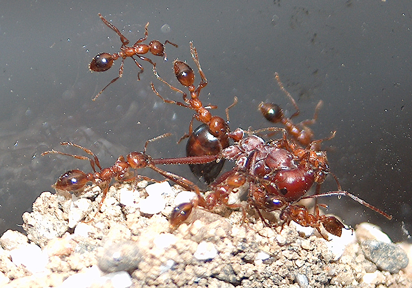 01.04. Gab heute 5 Lasius spec. Arbeiter (eine schon kampfunfähig gewesen)hinein die alle nach one vs one kämpfen ohne Verluste erledigt wurden. Auch eine geschwächte Myrmica wurde nach anfänglichen Abtastungen (da sie passiv war) doch noch getötet.