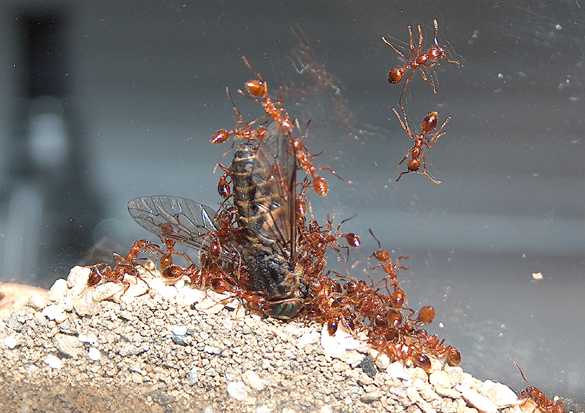 01.07. Heute nachdem ich gerade eine große Fleischfliege die nicht mehr fleigen konnte geopfert habe - sah ich beunruhigendes! Arbeiter liefen mit Körperteilen (je Kopf, Rumpf und Hinterleib) einer Manica Königin herum die nach der größe des Hinterleibs durchaus die Königin der Kolonie sein könnte! Auch beobachtete ich das andere Ameisen an denen die Träger vorbei kamen sich sogleich in die Leichenteile verbissen - so als ob sie sie töten wollten was eh schon tot war. Hab noch keine Königin im Bau finden können - meine Hoffnung ist ja, dass es nur eine Jungkönigin ist die getötet wurde oder die alte durch eine neue ersetzt wurde - werde weiterhin ausschau nach der Königin halten.