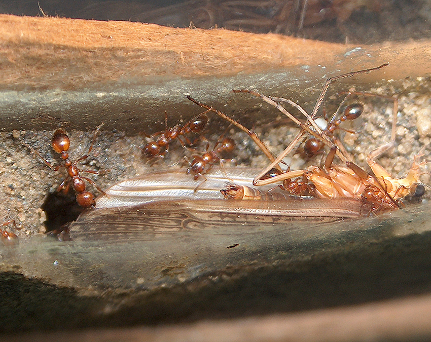 04.03. Anscheinend ist das Heimchen doch zu groß für die noch eher kleinen Arbeiterinnen der Manica rubida Königin.