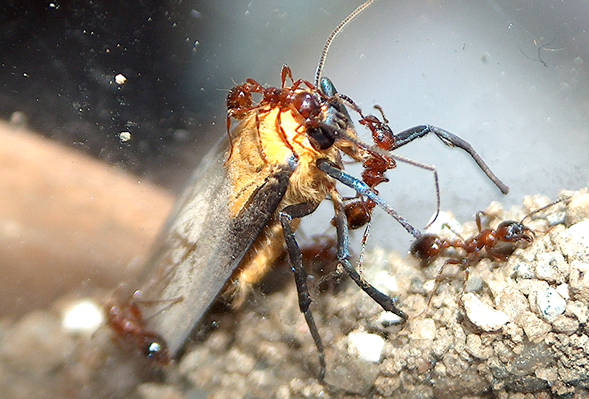 13.06. Futter für heute war eine tote weibl. 15mm Skorpionfliege (Panorpa communis) sowie eine kleien 5mm Fliege. Seitdem ich gestern das Formikarium befeuchtet habe, haben sie in dem angehäuften Auswurfshaufen einen Gang hinein gegraben. Die Skorpionfliege nahmen sie aber nicht - deshalb wieder hinaus gegeben.