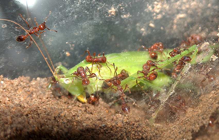 25.06. Kam noch zusätzlich 2 Grashüpfer (13mm rotbrauner u. 15mm braungrüner) hinein - die sich aber nicht fangen ließen da noch immer hoch genug sich fortbewegen. Probierte heute auch andere ungewöhliche Futtertiere wie 4 Marienkäferlarven und eine 4mm Raubwanze. Die Kleinste 3mm Larve wurde als erstes entdeckt und leicht überwältigt. Die Raubwanze wurde als 2. erwischt und auch abtransportiert. Nur die größte Marienkäferlarve ca. 7mm wehrte sich mit einem Sekret aus ihrem Hinterteil dessen Geruch die Ameisen überhaupt nicht mochten! So entkam sie zwei Mal den angriffen der Ameisen - auch nachdem eine sie schon länger am Bein hielt griff eine zweite Ameise nicht an, weil sie den Geruch nicht mochte. Die Ameisen scheinen das Sekret direkt beim Mund los werden zu wollen und sind so immer beschäftigt mit dem Wehrsekret der Larve.