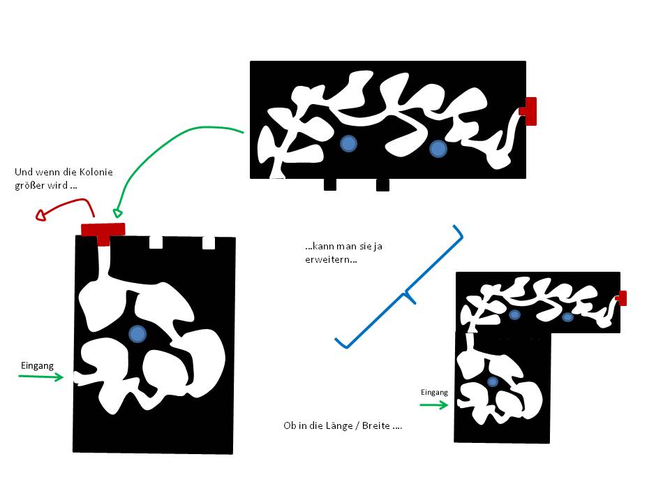 Erweiterung habe ich mir zwar auch schonmal Gedanken gemacht, aber das war nur so wirres Zeugs. Z.B. die Nester stapeln, aber dann ist die Einsicht behindert. Sieht aber bestimmt super aus, weil man durch alle Schichten durchgucken kann.