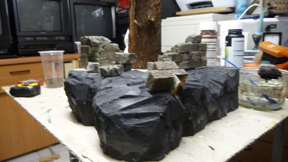 Wieder die ĂŒbliche Vorgehensweise. Styrodur mit Teppichmesser bearbeitet, schwarz grundiert, grau trockengebĂŒrstet. Ich denke aber, wenigstens einmal sollte ich noch darĂŒber gehen. Auf dem Bild glĂ€nzt alles noch sehr frisch. Abwarten.
