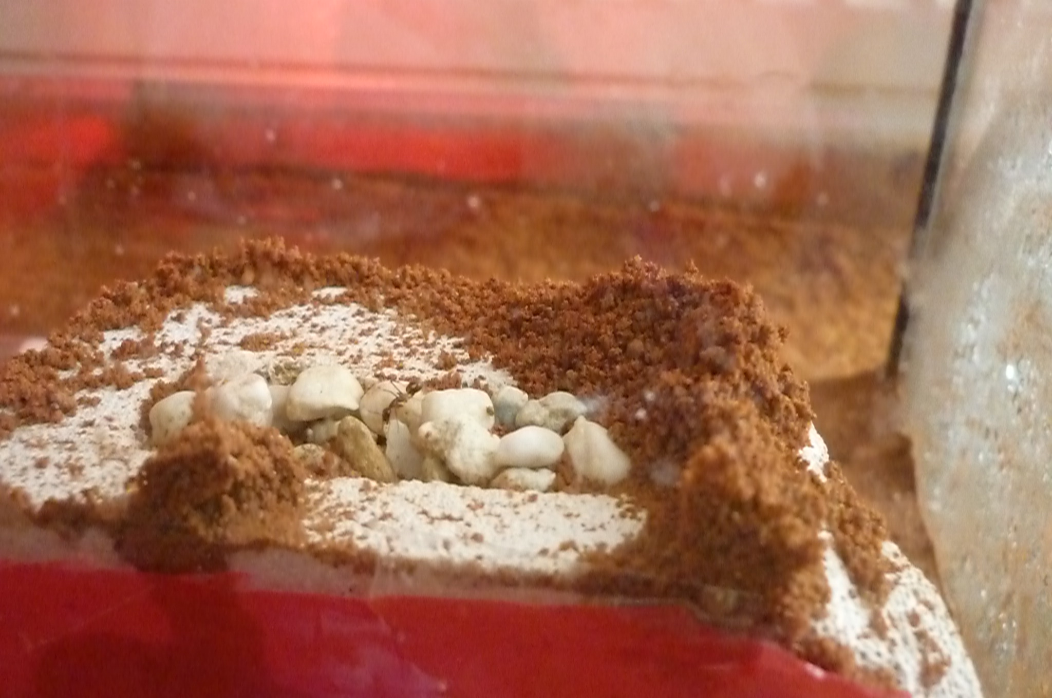Meine C.substitutus ca. 40 Arbeiterinnen große Kolonie wohnt in einem ca. 10x13cm großem Ytongstein. Der Nesteingang liegt auf der Oberseite des Steins (Auf dem 1.Bild blau markiert). Dahinter liegt, am Kies deutlich zu erkennen, der Wassertank.