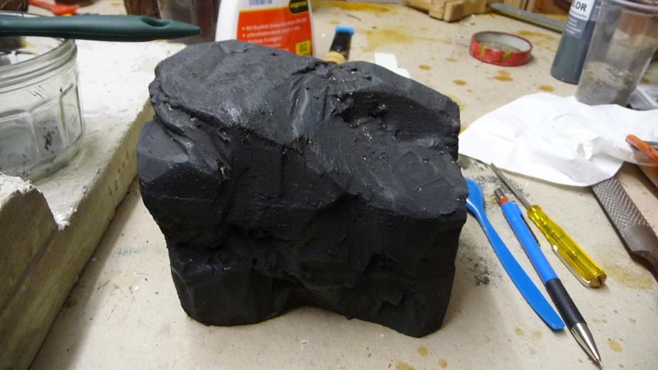 Wieder die ĂŒbliche Vorgehensweise. Styrodur mit Teppichmesser bearbeitet, schwarz grundiert, grau trockengebĂŒrstet. Ich denke aber, wenigstens einmal sollte ich noch darĂŒber gehen. Auf dem Bild glĂ€nzt alles noch sehr frisch. Abwarten.