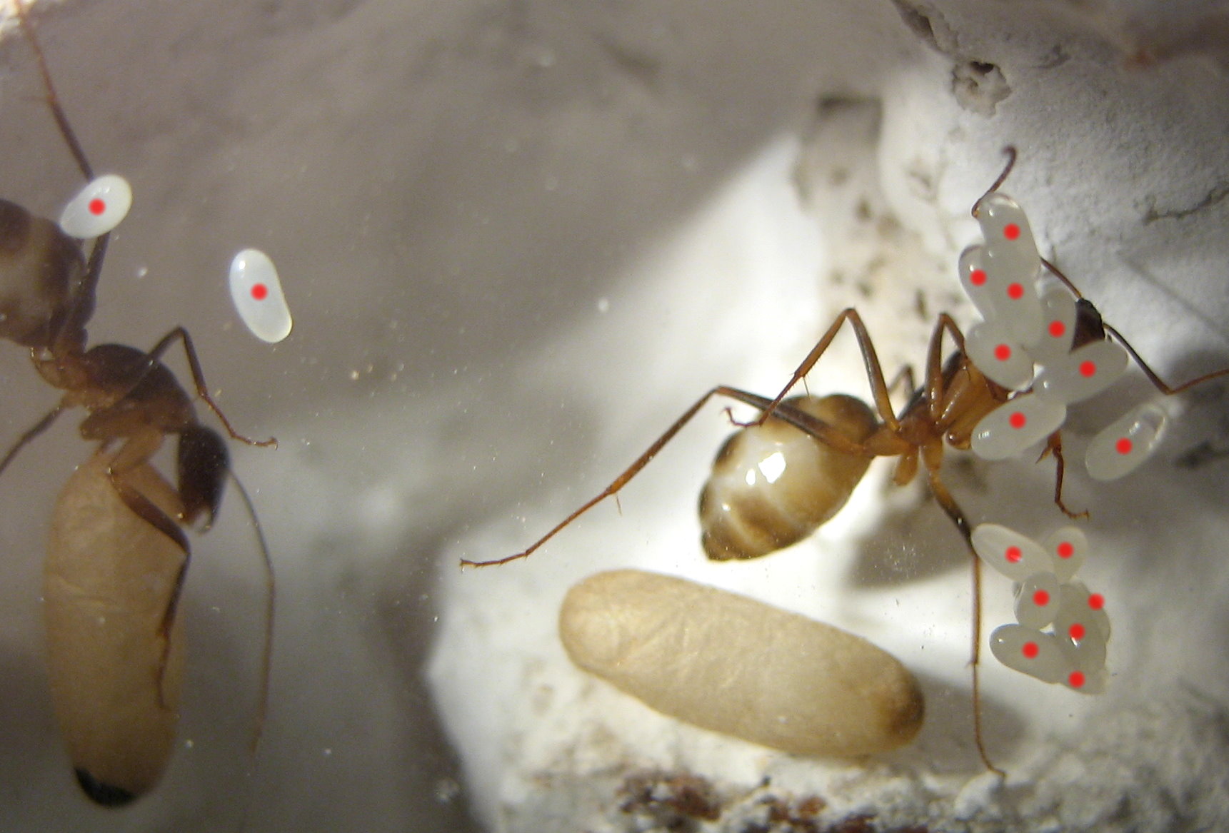 - Die Eier kommen nun in Schüben. Alle zwei Tage legt die Gyne bis zu fünf Eier, zwischendurch mal ein bis zwei. Das kürzeste Intervall lag bisher bei 2,5 Stunden. Ein Ende ist (hoffentlich) noch nicht in Sicht, da das vorherige Gelege eigentlich überboten werden sollte. Bei dem "Bergen" der Eier bedienen sich die Arbeiterinnen einer interessanten Technik, indem sie das Ei mit ihren Mandibeln festhalten und sich mit den Vordergliedmaßen von der Gaster der Gyne abstoßen (1), (2), (3).