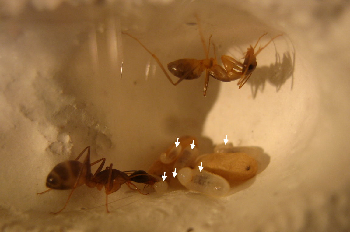 • Beobachtung: Nachdem zwei Mehlwurm-Hälften vor dem Nest angeboten wurden, löst eine Arbeiterin einen winzigen Happen aus dem Futtertier und bringt ihn auf direktem Wege zu einer Larve, auf welcher das Futter auch sofort serviert wird. Schlussfolgerung: Futter muss nicht immer erst über Nestgenossinnen weitergereicht werden.