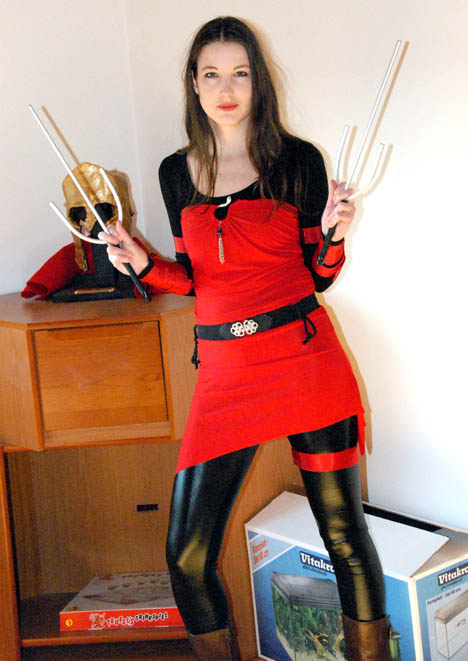 Dann 2 Fotos von meiner Freundin die als Elektra ging - man beachte die Sai´s die ich ihr gebaut hab. Sie hat auch als einziger mit mir ihr Kostüm selber gestaltet - alle anderen haben es gekauft und angepasst sowie etwas modifiziert - nur Captain America - naja - der hätte es wohl besser auch anpassen sollen - hing zu schlaff alles herunter bei ihm *G*