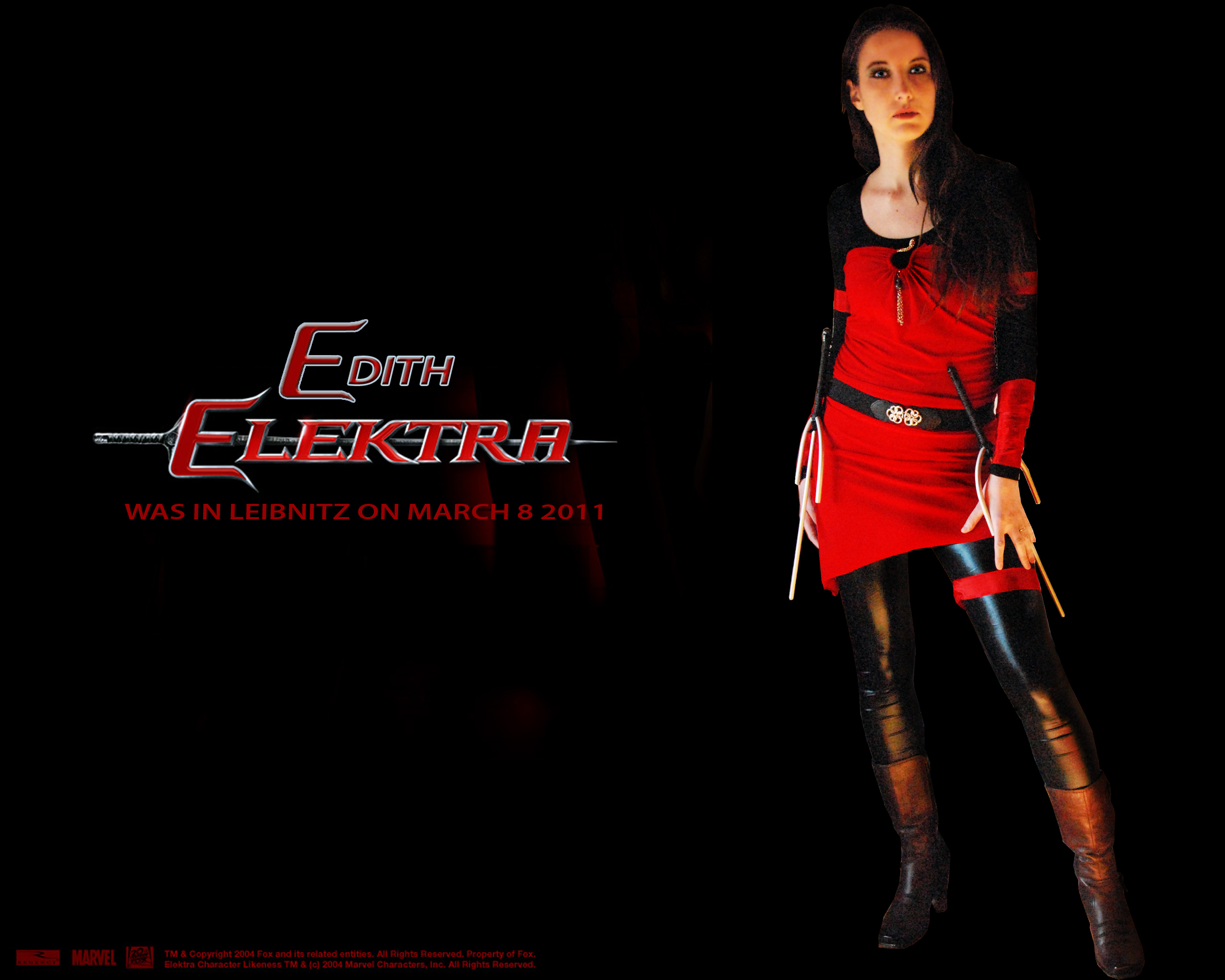 Dann 2 Fotos von meiner Freundin die als Elektra ging - man beachte die Sai´s die ich ihr gebaut hab. Sie hat auch als einziger mit mir ihr Kostüm selber gestaltet - alle anderen haben es gekauft und angepasst sowie etwas modifiziert - nur Captain America - naja - der hätte es wohl besser auch anpassen sollen - hing zu schlaff alles herunter bei ihm *G*