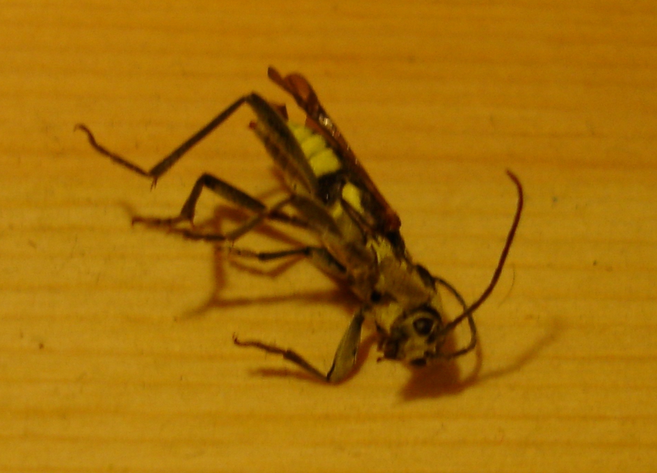 In erschlagenem Zustand sieht der Käfer auf den Fotos etwas "wespenartig" aus, finde ich. Das täuscht. Das untere Flügelpaar ist sonst nicht zu sehen, darüber liegt sonst ein Paar Deckflügel(?), wodurch der Käfer kompakter wirkt.