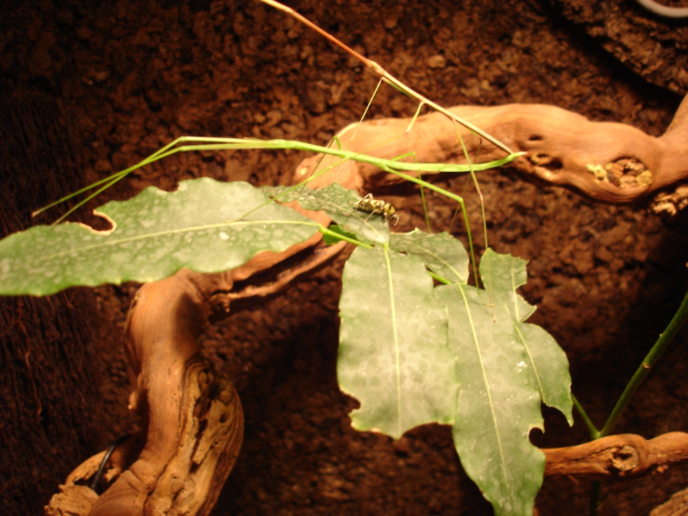 Vor Kurzem sonnte sich dann plötzlich ein mir bis dahin unbekannter Gast unter der Terrarienlampe. (siehe Fotos: Käfer auf Blatt/mit Stabschrecken)