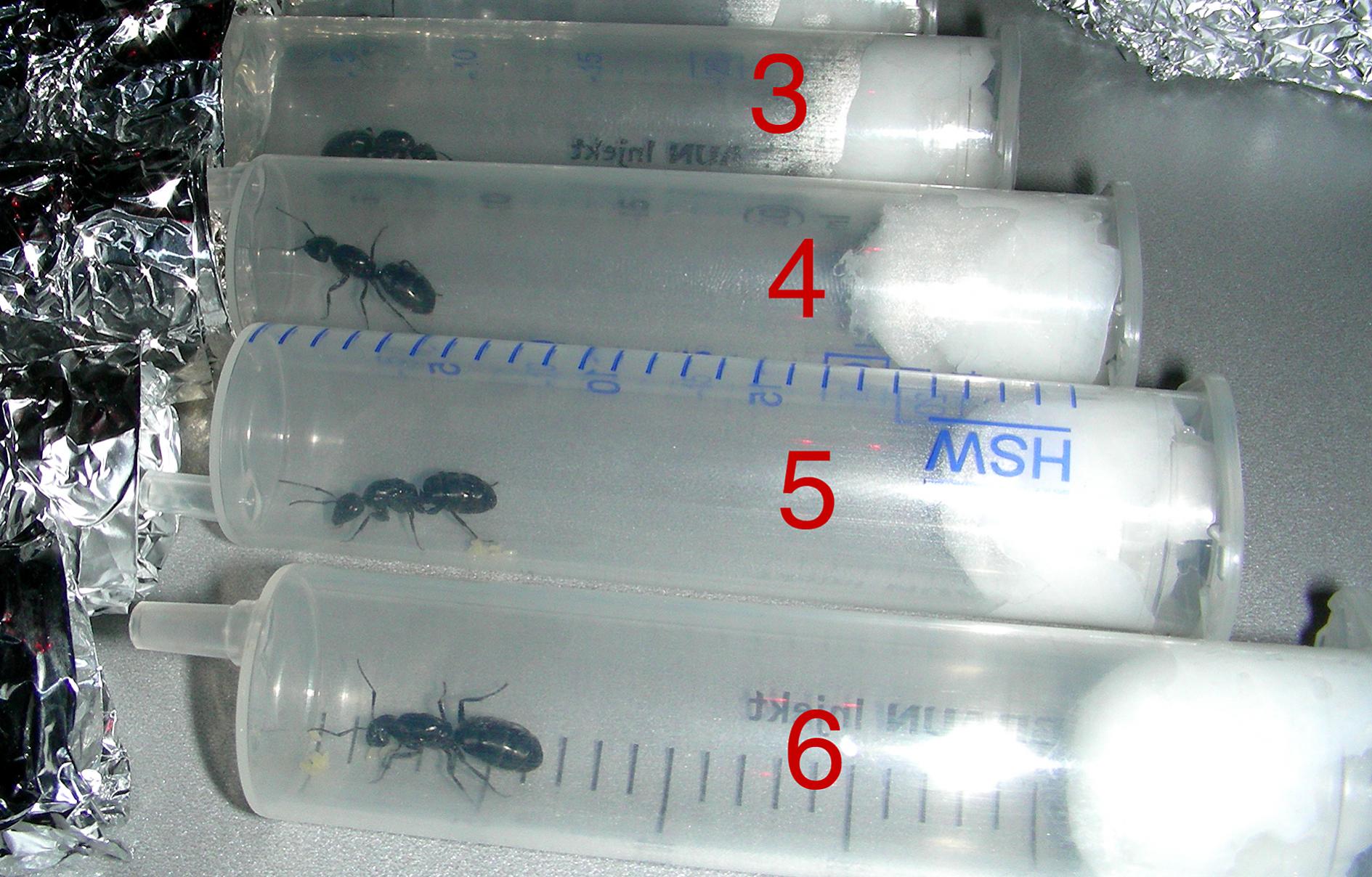 Gab Nr. 3 und Nr. 7 Honigwassertropfen (Gemisch aus Wald-, Akazien- & Gebirgsblütenhonig) hinein an dem sie bei Entdeckung sofort ihre Gaster wieder dick getrunken haben. Danach Rest vom Honigwasser mit Wattestäbchen restlos entfernt. Gyne durch Öffnung der Watte nur kurze Zeit Stress gehabt - als sie checkte das Watte wieder Eingang verschloss - schnell beruhigt. Die anderen nicht gefütterten Gynen haben noch eine sehr schlanke Gaster, bis auf Nr. 8 - die eine durchschnittliche Größe hat (nicht zu dick nicht zu schlank).