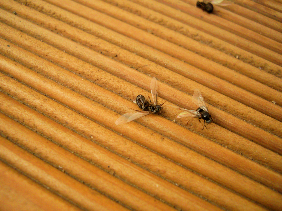 wir sind heute am späten nachmittag nach hause gekommen und haben auf unserer terrasse tote ameisenköniginnen entdeckt.