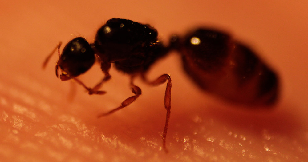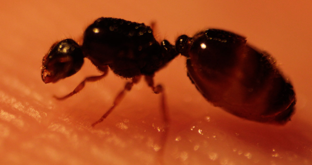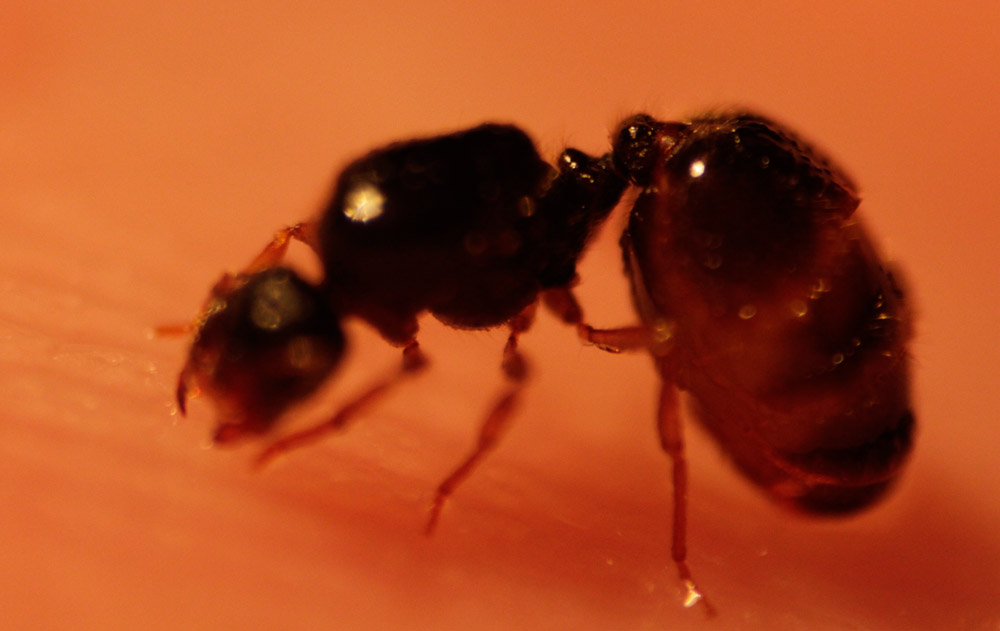 Man kann sehr schön erkennen: Eine Gyne der Art Solenopsis fugax! Es fehlen sämtliche Kennzeichen für Tetramorium, die mir bekannt wären. Soweit ich weiß erkennt man sie gegenüber Tetramorium sehr leicht an dem/n fehlenden Propodealdorn(en) und an der glatten Kopfoberfläche.