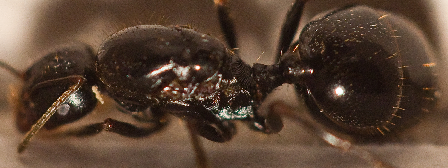 Die Gaster ist eher sporadisch behaart, auffallend ist eine stark geriffelte struktur am Thorax kurz vor dem Petiolus, der Thorax und der Kopf sind hingegen insgesamt glatt.