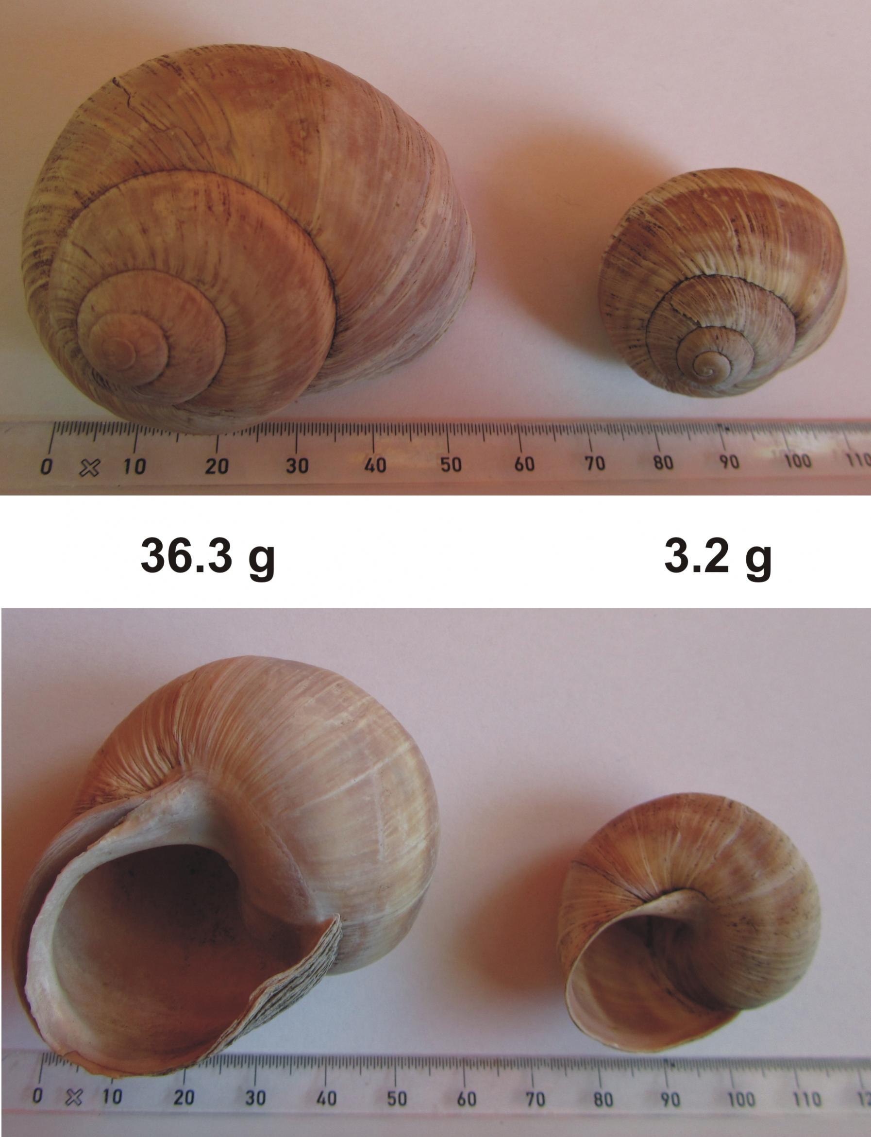 Eine Weinbergschnecke wiegt im ausgewachsenen Stadium durchwegs um die 30 Gramm (plus/minus). Beim Kriechen misst ihr Körper bei der ausgestreckten Phase an die 10 cm. Die kleinere Ausgabe ist noch ein Jungtier.