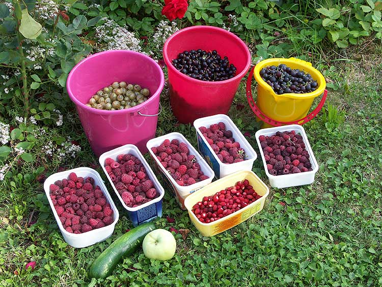 [font=Times New Roman]In Bild 3 ist ein Teil der Beerenernte im Juli 2004 vom WE-GrundstĂŒck gezeigt. Da gab es noch Stachelbeeren (links oben). Jetzt sind sie alle dem amerikanischen Stachelbeerrost zum Opfer gefallen. – Was noch geht, sind Erdbeeren und jede Menge Walderdbeeren (vorn im Bild), Himbeeren, Johannisbeeren und Josta (die beiden Eimer rechts oben; das ist eine Kreuzung aus Stachelbeere und Schwarzer Johannisbeere; darauf hat sich anscheinend noch kein SchĂ€dling spezialisiert).[/font]
