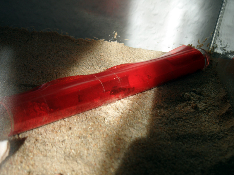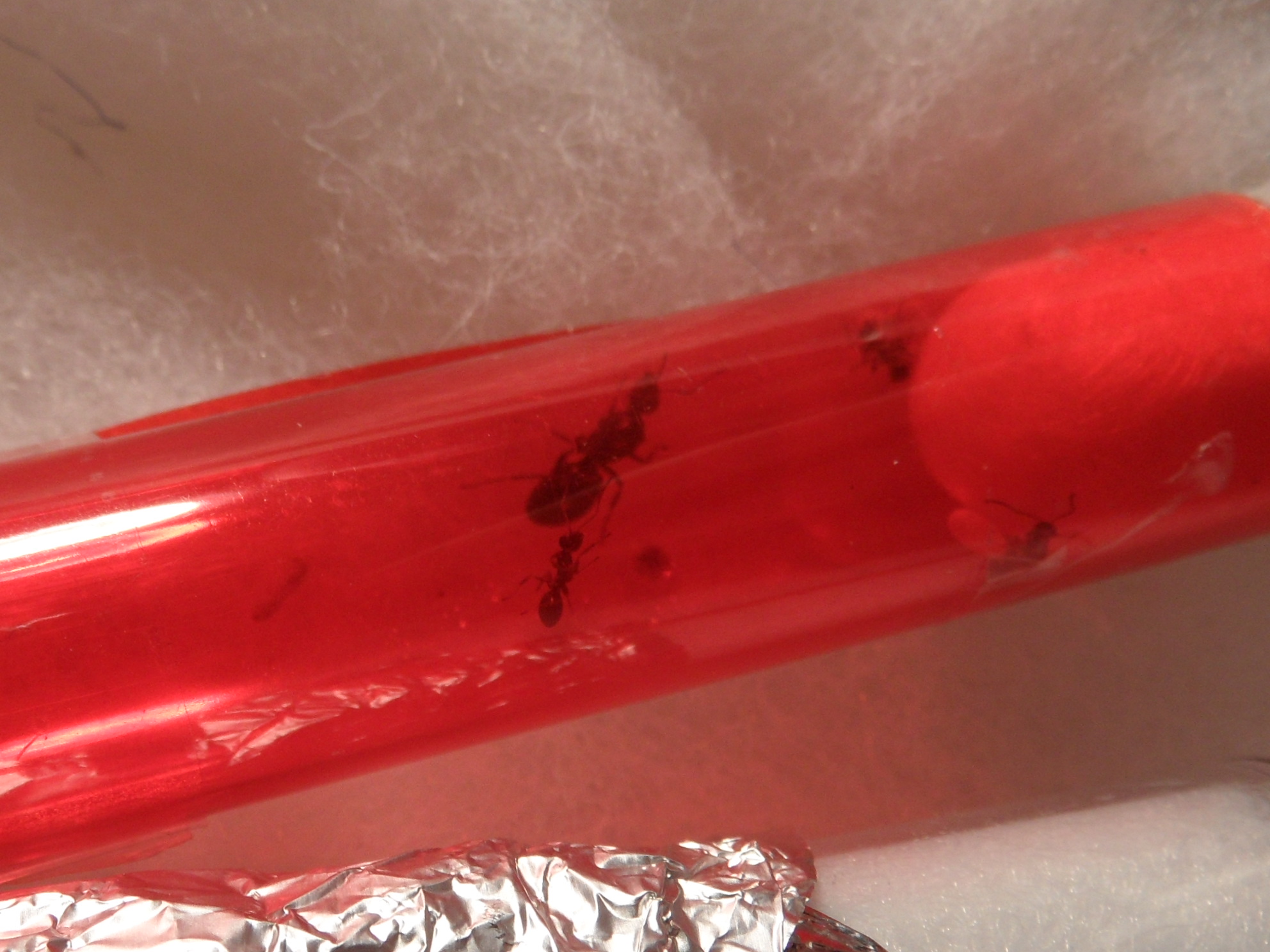 Den Mehlwurm haben sie ins Reagenzglas geholt, da sitzt die Königin nun drauf. Zudem konnte ich gestern eine Arbeiterin beobachten, wie sie unermüdlich Sand ins Reagenzglas getragen hat. Dabei ist sie ewig draußen herumgelaufen und es sah aus als würde sie jeden Sandkorn genau prüfen, welcher jetzt der Richtige zum Hereintragen ist.