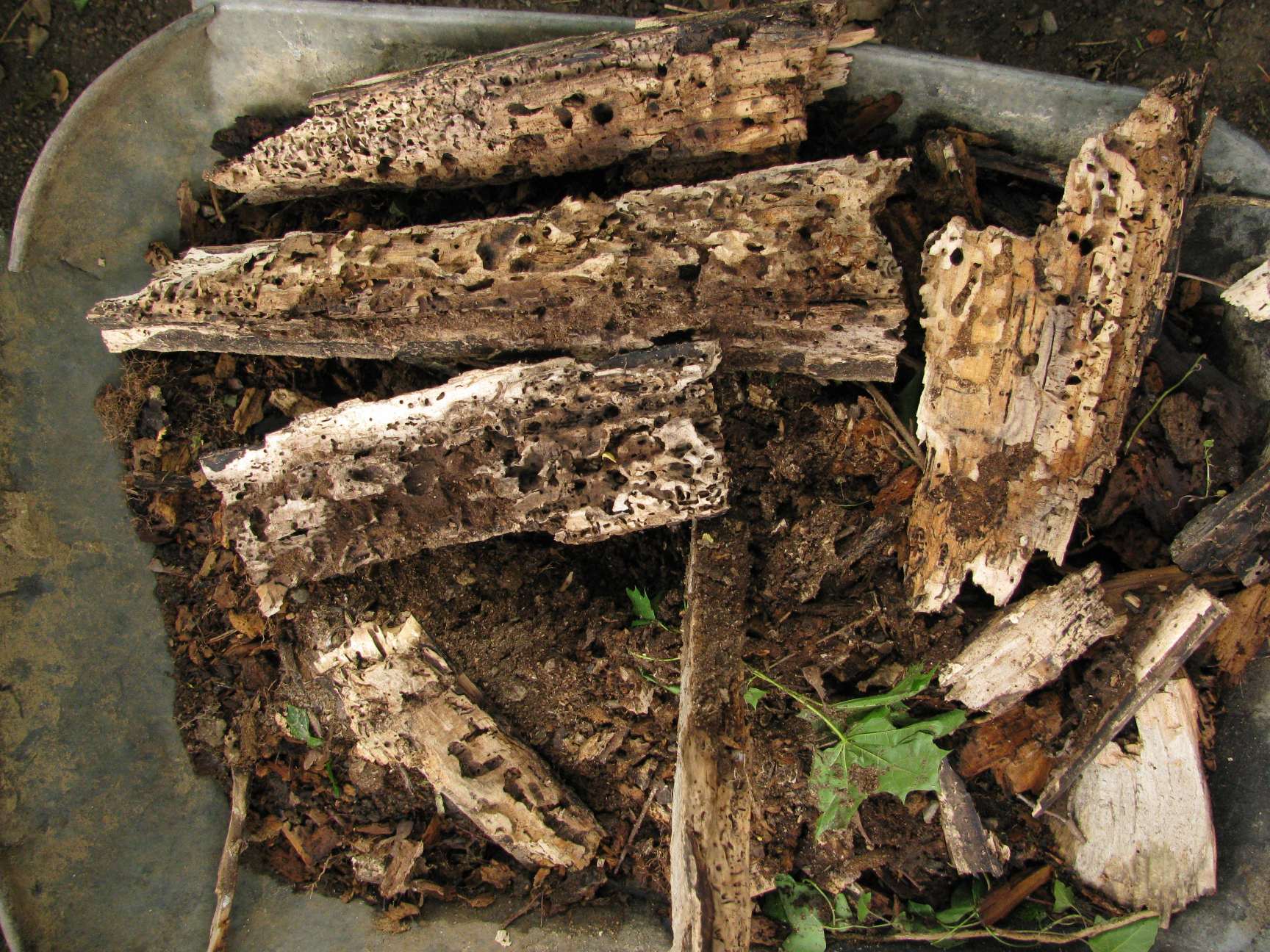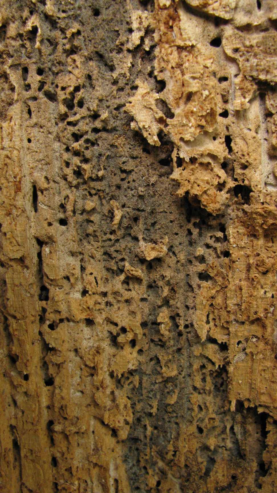 Das Nest war rießig (Mannhoch 30 - 40 cm durchmesser) mit lauter höhlen und Bruträumen, allerdings sind auch kleine Löcher im Holz die eher auf Holzwürmer hinweisen... (Holzmehl, muffiger Holzgeruch, dunkle Holzfarbe)