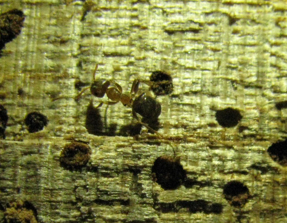 Die Ameisen haben im bereits morschen Holz ihr Nest gebaut, d.h. nachdem Pilze das Holz in eine bröselige Struktur verwandelt hatten. Die Gänge stammen von den Ameisen.