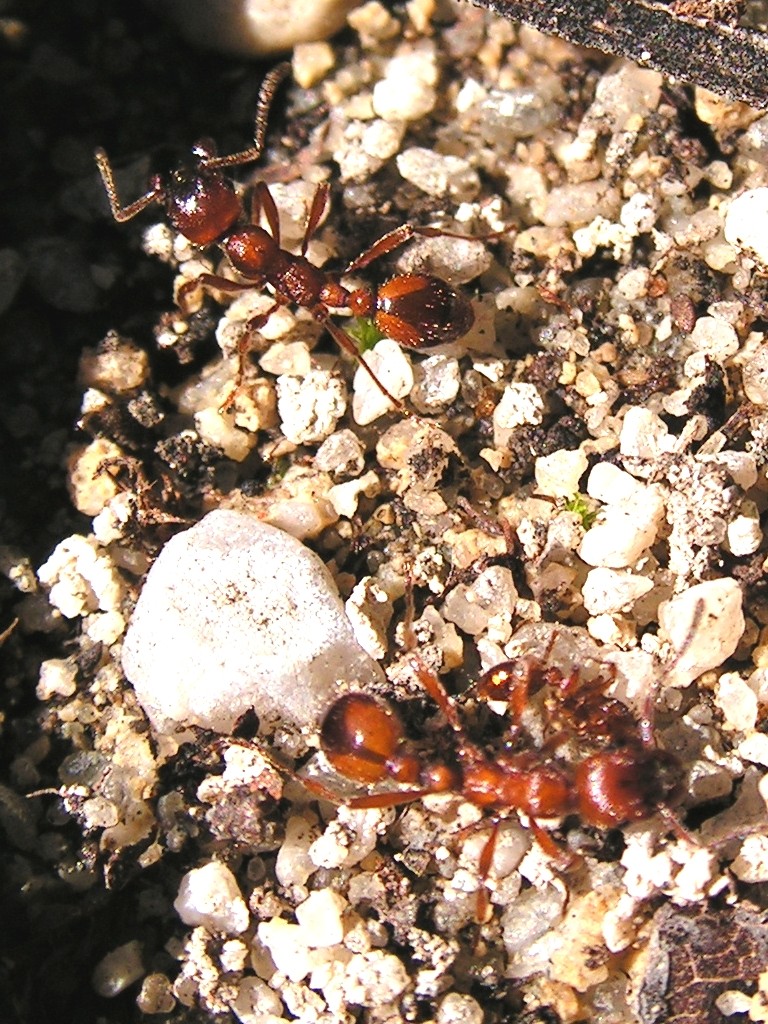 Jetzt kommen wir aber zu einem anderen Punkt: Wie sieht das VerhÀltnis von Manica rubida zu einigen Myrmica-Arten aus? Vor Jahren konnte ich beobachten, dass Myrmica-Arbeiterinnen immer wieder in ein Manica-Nest liefen und von den Manica-Arbeiterinnen prompt immer wieder herausgetragen und abgesetzt wurden. Da gab es schon auch einmal ein Gezerre, aber wirklich feindselig sah das VerhÀltnis nicht aus.