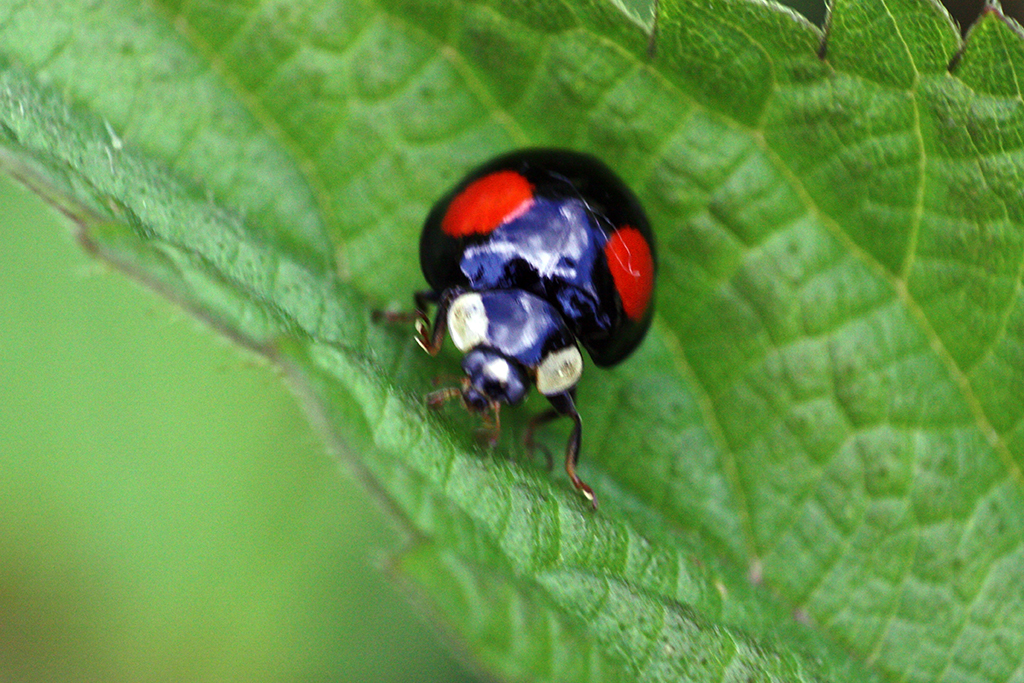 Foto 6: ein schwarzer Marienkäfer, leider etwas unscharf. Dafür spiegelt sich der Himmel auf seinem Rücken