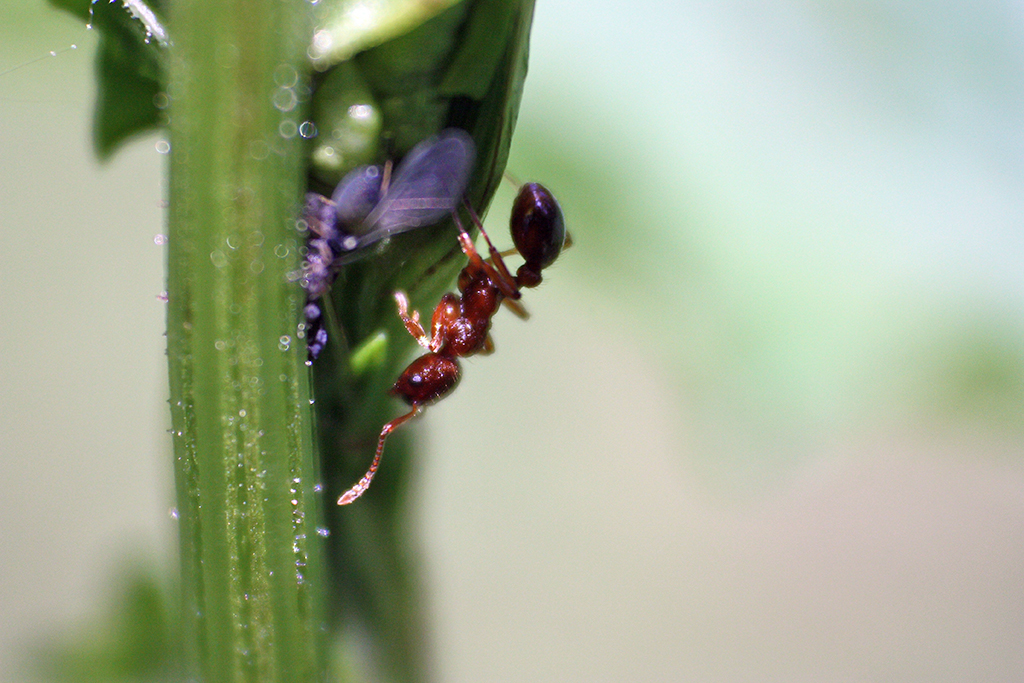 Foto 5: eine Ameise Myrmica sp beim Bewachen der Blattlauskolonie
