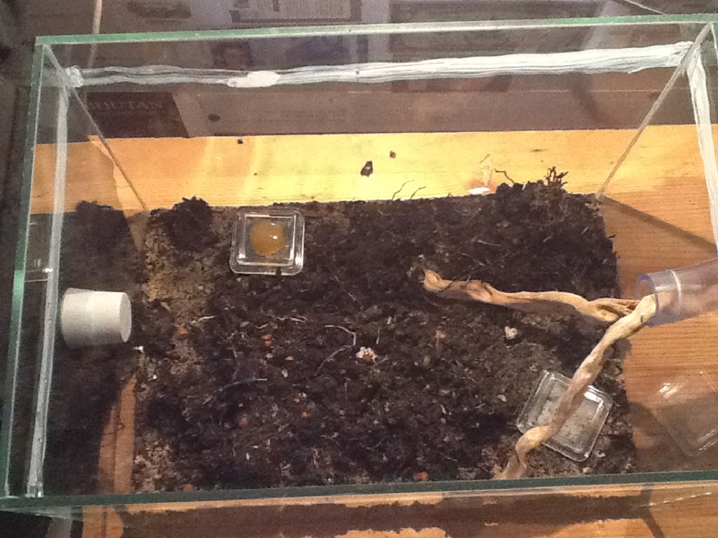Kurzerhand war das Nest komplett feucht.Es mit einer Wärmematte aufzuwärmen und das Wasser raus zu bekommen half nichts. In der zweiten Nacht verließen sie das Nest und siedelten sich unter den Pflanzen in der Arena an.