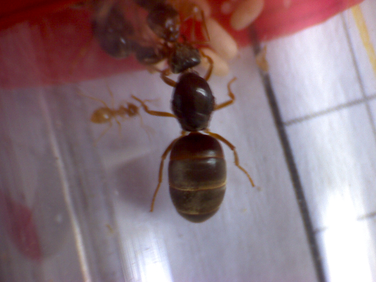 Die ersten beiden Fotos zeigen eine Art, die ich mitte Mai im Gemüsebeet gefunden und ausgegraben habe. Die Königinen sind ca 7-8 mm groß. Vorne sind sie schwarz, und am Hinterteil sind sie hellbraun "gestreift". Die Arbeiterinnen sind 2 mm lang und braun.