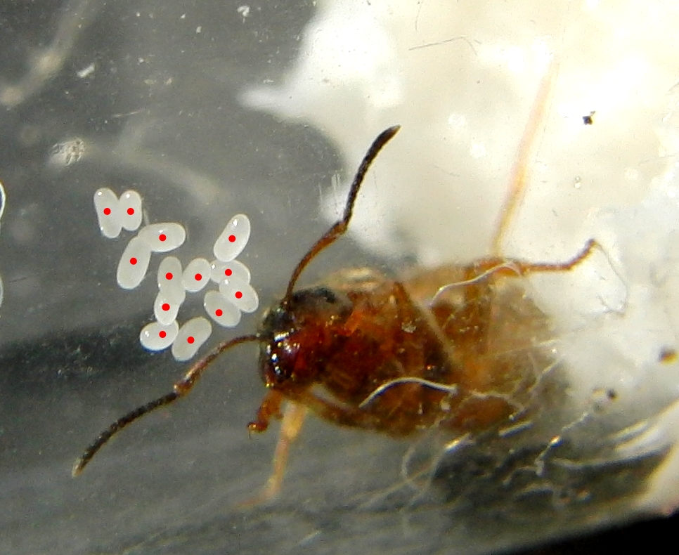 Vier Tage nach dem Fund hat die Gyne bereits acht Eier abgesetzt und ist leicht physogastrisch. Trotz claustraler Gründung habe ich ihr Nahrung angeboten. Ich freue mich auf die Haltung, es handelt sich um eine sehr aktive Lasius art die in warmen Gebieten ähnlich dominant wie Lasius niger auftritt, dort ist sie ihr sogar überlegen. Sie bevorzugt Felsbiotope. Zu finden ist diese Art in altem lockerem Gemäuer, wie zwischen Felsspalten aber auch in Totholz. Dort findet man dann auch Kartonartige Nester. Sie werden aus Totholz und mineralischen Bestandteilen hergestellt.
