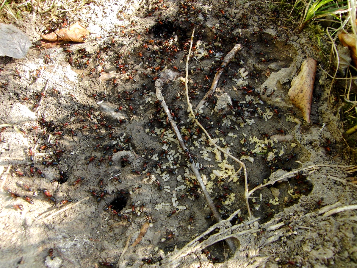 Dieses Bild ist gut ausgeleuchtet, somit kommt der Rotanteil dieser Tiere allgemein besser zum Vorschein. Auch ein gutes Beispiel sind gerade diese Tiere die sonnenexponiert nisten, wo wir wieder bei Formica sp. sind mit rotem Mesosoma oder auch Camponotus ligniperdus/herculeanus.