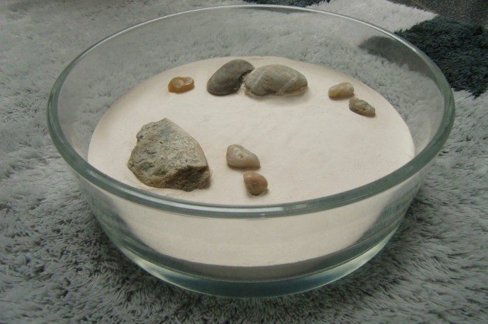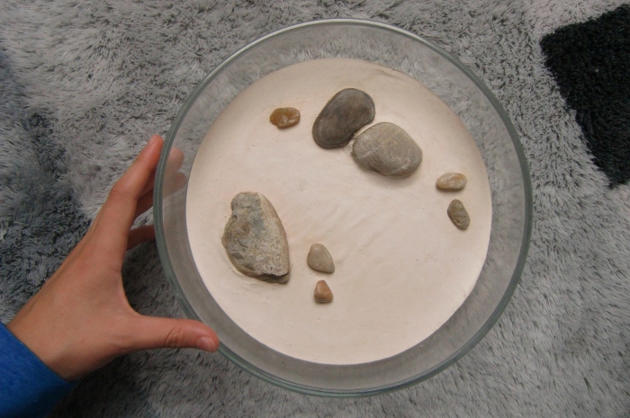 Zuerst sollte die Wanne grĂŒndlich gereinigt werden. Danach kann der Gips angerĂŒhrt werden. Erstrebenswert ist eine jogurtĂ€hnliche Konsistenz, sodass man ihn gut zum AusgieĂen der Wanne verwenden kann. Der Gips kann nun wahlweise mit Lehmpulver oder Abtönfarbe eingefĂ€rbt werden. WĂ€hlt man Lehmpulver, sollte man darauf achten, dass die Masse nicht zu trocken wird. Also lieber etwas mehr Wasser hinzugeben. AnschlieĂend kann die Wanne vorsichtig ausgegossen werden. Sollten die WĂ€nde etwas abbekommen, kann man den Gips noch gut mit einem feuchten KĂŒchentuch entfernen. Gleich daruf können die Steine in beliebiger Anordnung in den Gips gedrĂŒckt werden. Wenn erwĂŒnscht kann auch noch anderes Dekomatial verwendet werden, wie etwa Sand oder feiner Kies. Organisches Material sollte nicht eingegossen werden.