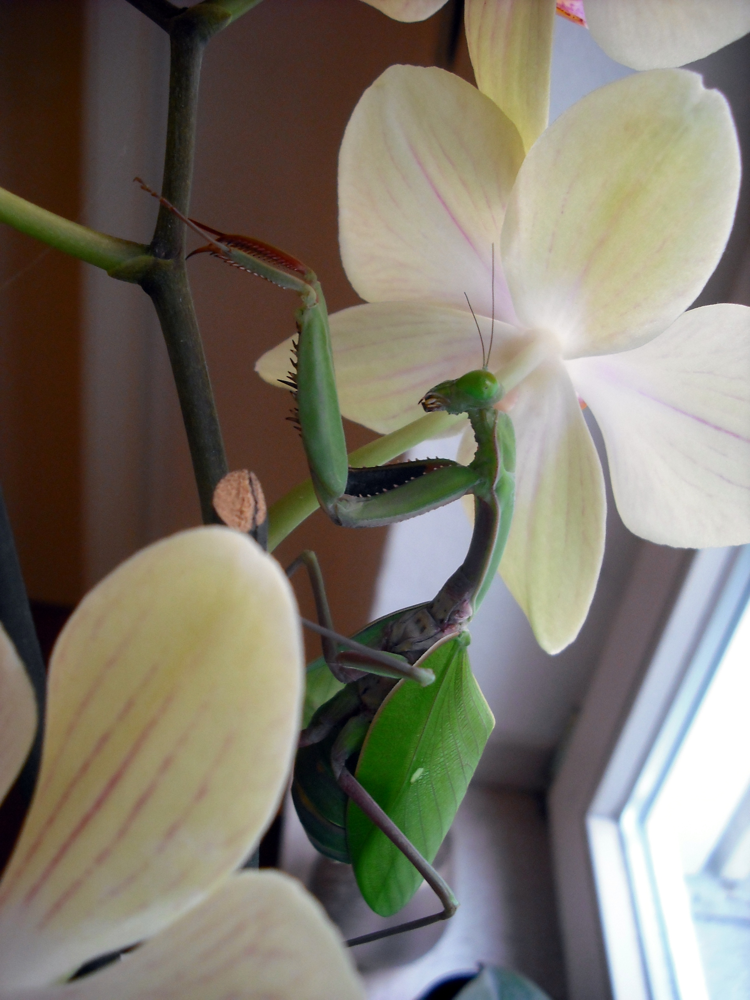 Mein Hierodula majuscula Weibchen auf einer Orchidee. Leider war ihre letzte Häutung nicht optimal verlaufen, sodass sie ihre Flügel nicht richtig falten kann und ihr Hals ein wenig verdreht ist. Ob sie fliegen kann, weiß ich nicht, allerdings stört es sie sonst nicht weiter.