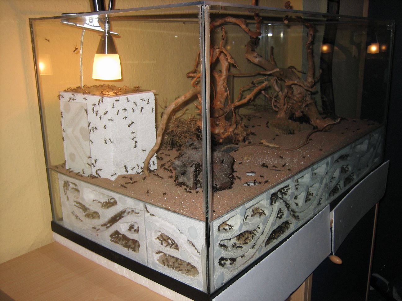 Allerdings durfte ich immer wieder beobachten, dass in der Nacht, wenn die Nestlampe aus ist, Arbeiterinnen diejenige Beckenscheibe belaufen, die durch Licht aus mehreren Metern Entfernung angestrahlt wird, also vom Schreibtisch oder Bett aus. Demnach hat also auch das Licht, und nicht die Wärme allein, einen Einfluss.