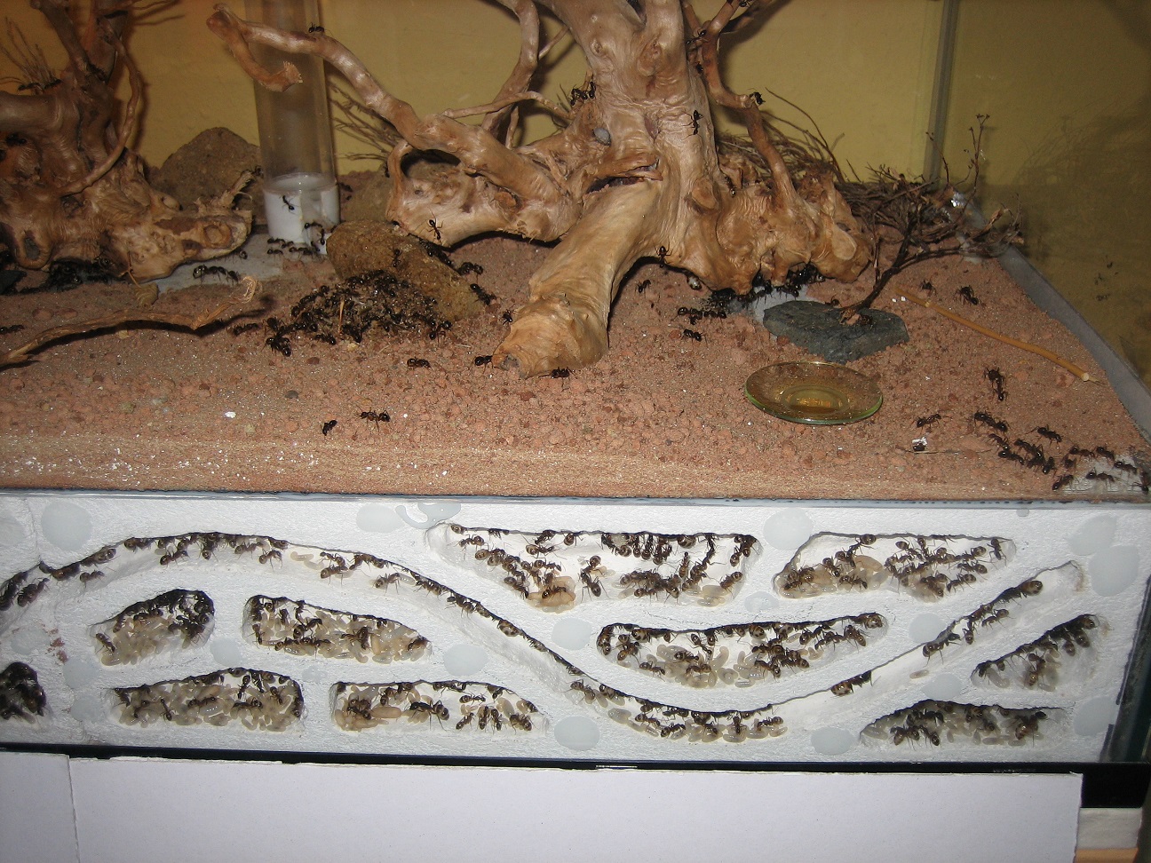 Für alle Neugierigen habe ich meine improvisierten Aufbauten noch mal mit dem Fotoapparat festgehalten (2), (3). Die Aufnahmen von oben sind leider noch nichts geworden (4). Die Idee war Ameisenstraßen während der Fütterung zu erkennen, aber es kam keine zustande. Camponotus gelten sowieso nicht als die großen Straßen-Former, aber vermutlich ist das Becken einfach zu klein.