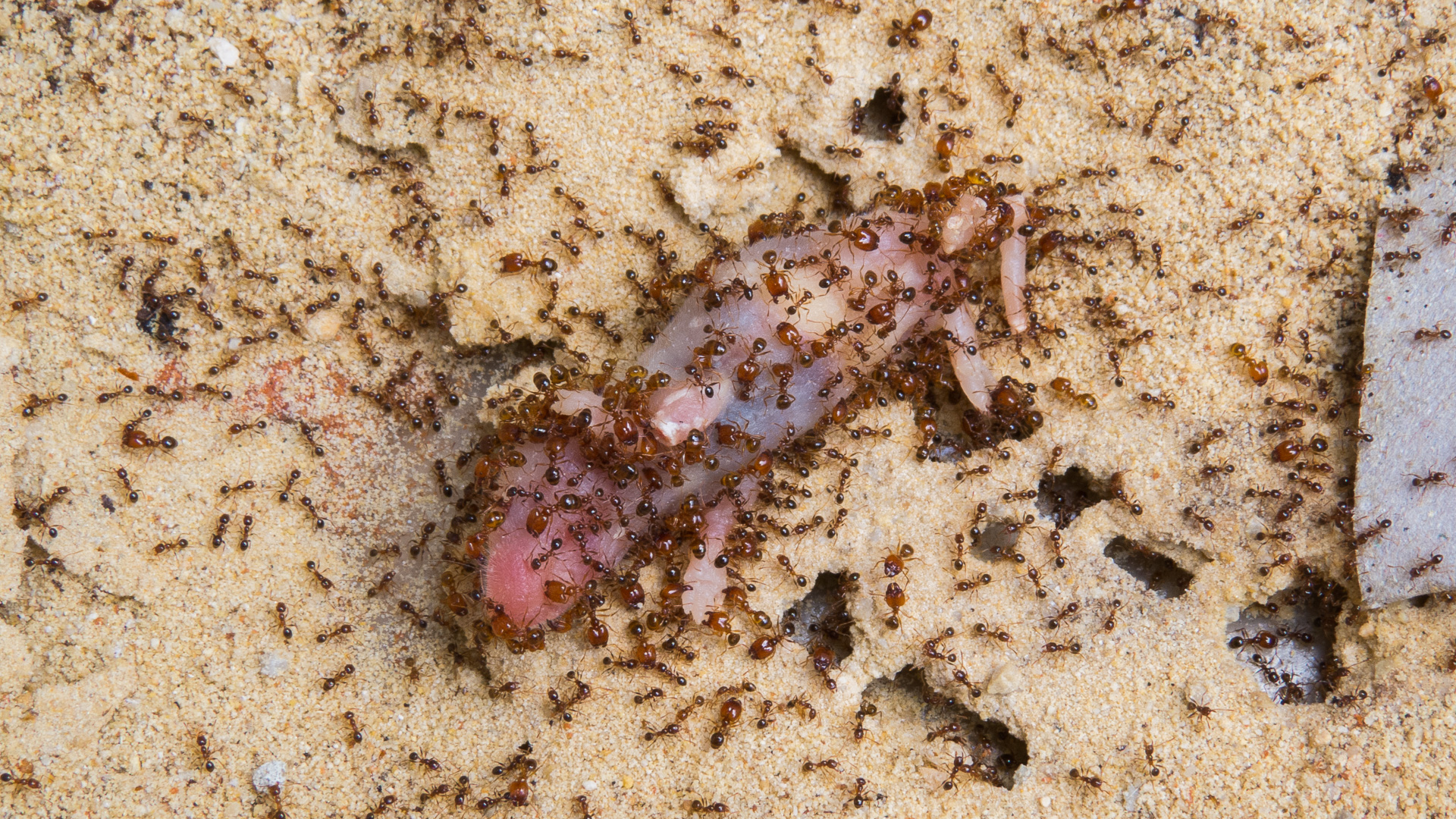 Ameisen lecken gerne Flüssigkeiten auf, die sie auch auf Fleisch finden, möglicherweise wegen Mineralien.