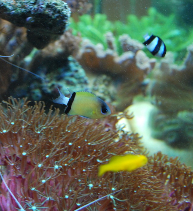 Im 350L Becken leben folgende Fische: 2x Gobiodon okinawae, 2x Ptereleotris evides, Salarias ramosus, Amphiprion percula und 6 Demoisellen.