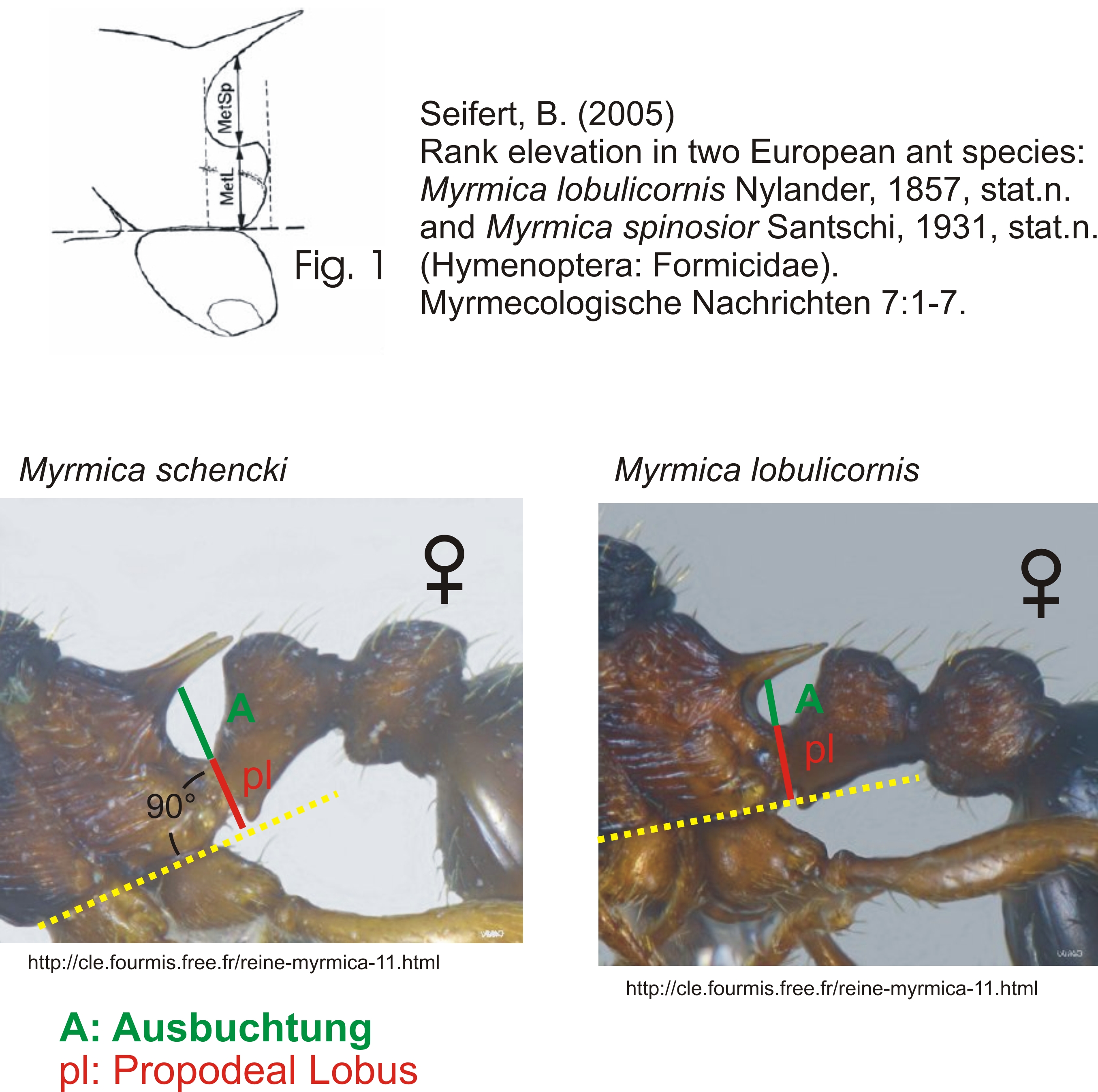 [font=Times New Roman]Ich habe jetzt erst bemerkt, dass Seifert in seinem Schlüssel ausdrücklich von der “Höhe” der Ausbuchtung unterhalb der Dornen, und der Höhe des lateralen Propodeallobus schreibt. Bekannt war mir der Vergleich der „Größe“ von Ausbuchtung vs. Lobus aus anderen Schlüsseln. – Leider nimmt Seifert in seinem Buch von 2007 keinen Bezug auf die Publikation von 2005 (obwohl diese unter Nr. 85 im Literaturverzeichnis steht). Man muss also tatsächlich die Abb. 1 in Seifert (2005) zu Rate ziehen um den geforderten Vergleich anstellen zu können.:mad:[/font]